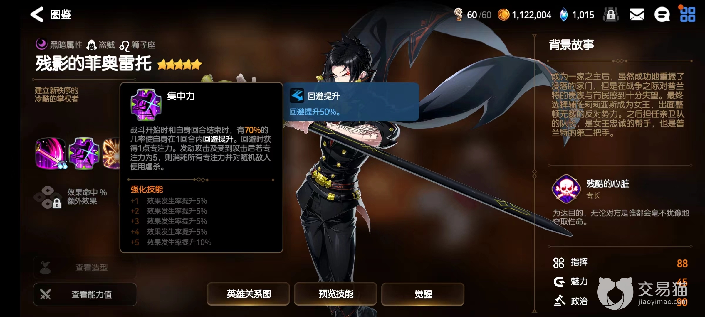 二技能“集中力”是一个没有冷却时间的被动技能,在战斗开始和自身回合结束时,会有70%几率提升50%的回避,这恰好与前文提到的设想不谋而合,配合对敌人命中的降低,这个回避能发挥极大作用,基本上只要两者同时触发,那么在接下来的持续时间里,菲奥雷托就是完全无法被伤害到的存在。而且回避成功之后他还可以获得一点专注,满专注时会进行一次虐杀并消耗所有专注,这个虐杀的伤害还算不错,可惜的是他攻击的目标是随机选定的。