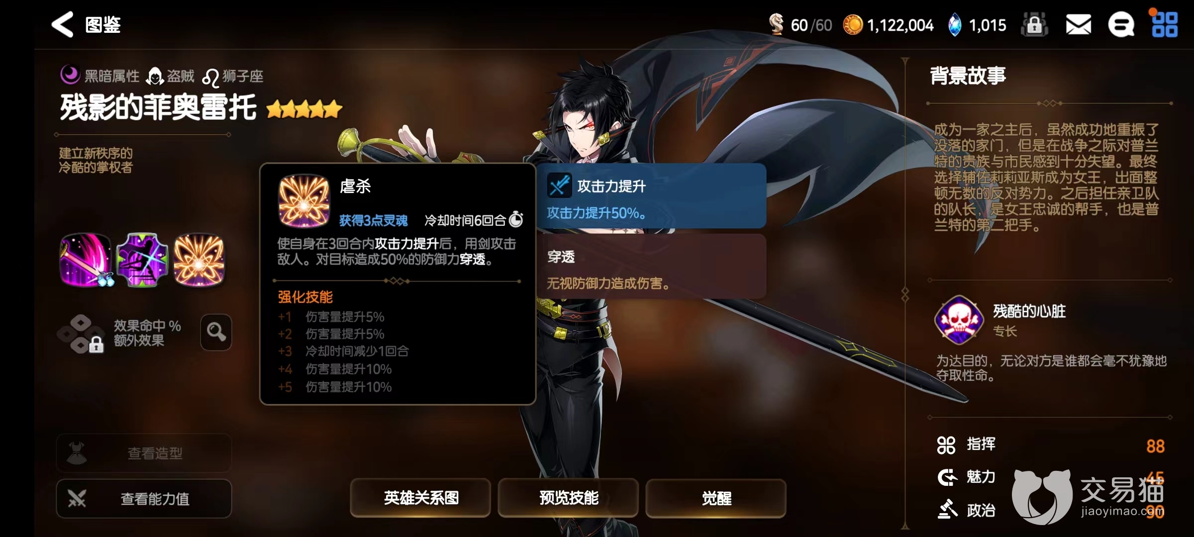 大招“虐杀”是一个具有延迟性的伤害,使用后会首先获得三回合的攻击力提升,之后会带着50%的穿透对敌人造成巨额伤害,这个伤害不论是用来打脆皮还是打肉都是十分好用的,因为首先它有着三次攻击所带来的角增伤,其次它还有着50%的穿透效果,两者相加之后这个伤害不论是面板数值还是实际输出都是非常恐怖的。