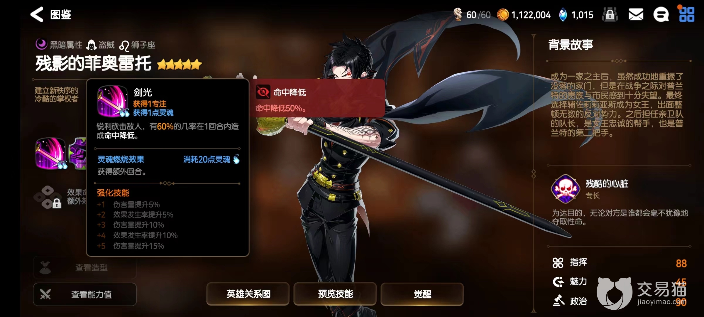 一技能“剑光”效果是造成单体伤害,并有60%几率提供命中降低效果,具体下降的幅度是50%,再配合上一些回避属性的加持,几乎能让敌人完全无法击中自己,这对于防御侧并不出众的菲奥雷托来说显然是一个不小的补强,另外通过燃烧灵魂,该技能还可以让其获得额外一个回合,这一个回合可以继续进行输出或者施放其他技能来打功能性,总之有了这个效果后战局的后续走向又能多出许多可能性。