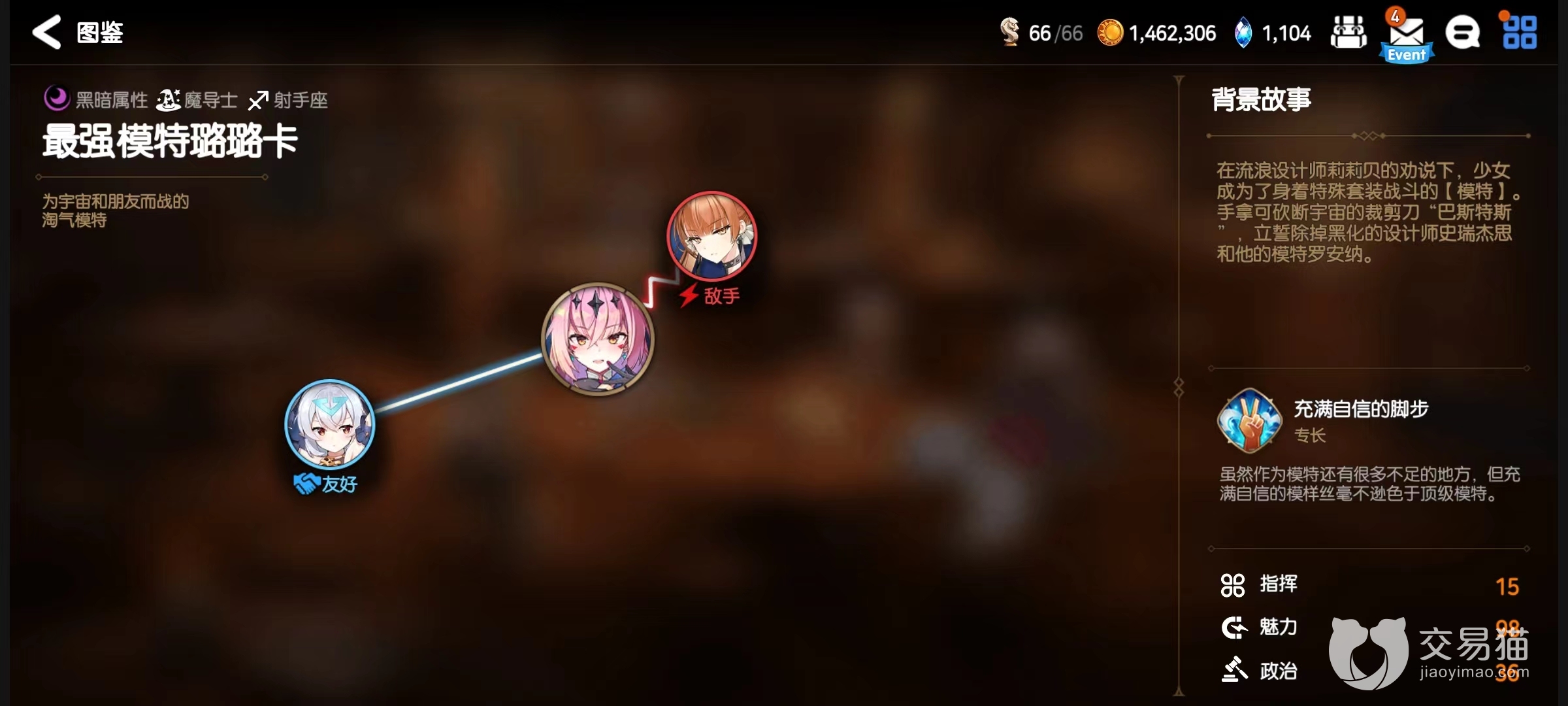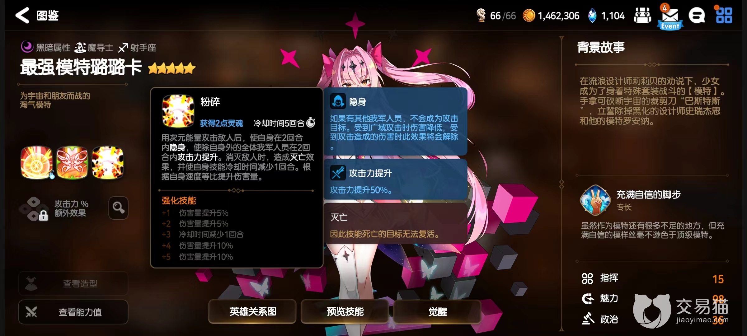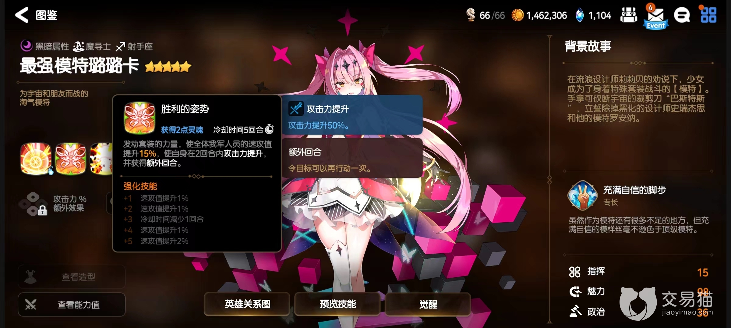 作为一名模特,在游戏过程中非常适合用来完成强大首领类型任务,有10%奖励加成。战斗方面第1个技能能量爆发,利用身上套装能量攻击敌人,在自身回合使用时有百分之四十几率发动一次同样额外攻击,燃烧灵魂之后效果发生率提升至100%。初始几率有些低,但是消耗灵魂后几乎能做到必定发动,这对输出是非常有效的提升。