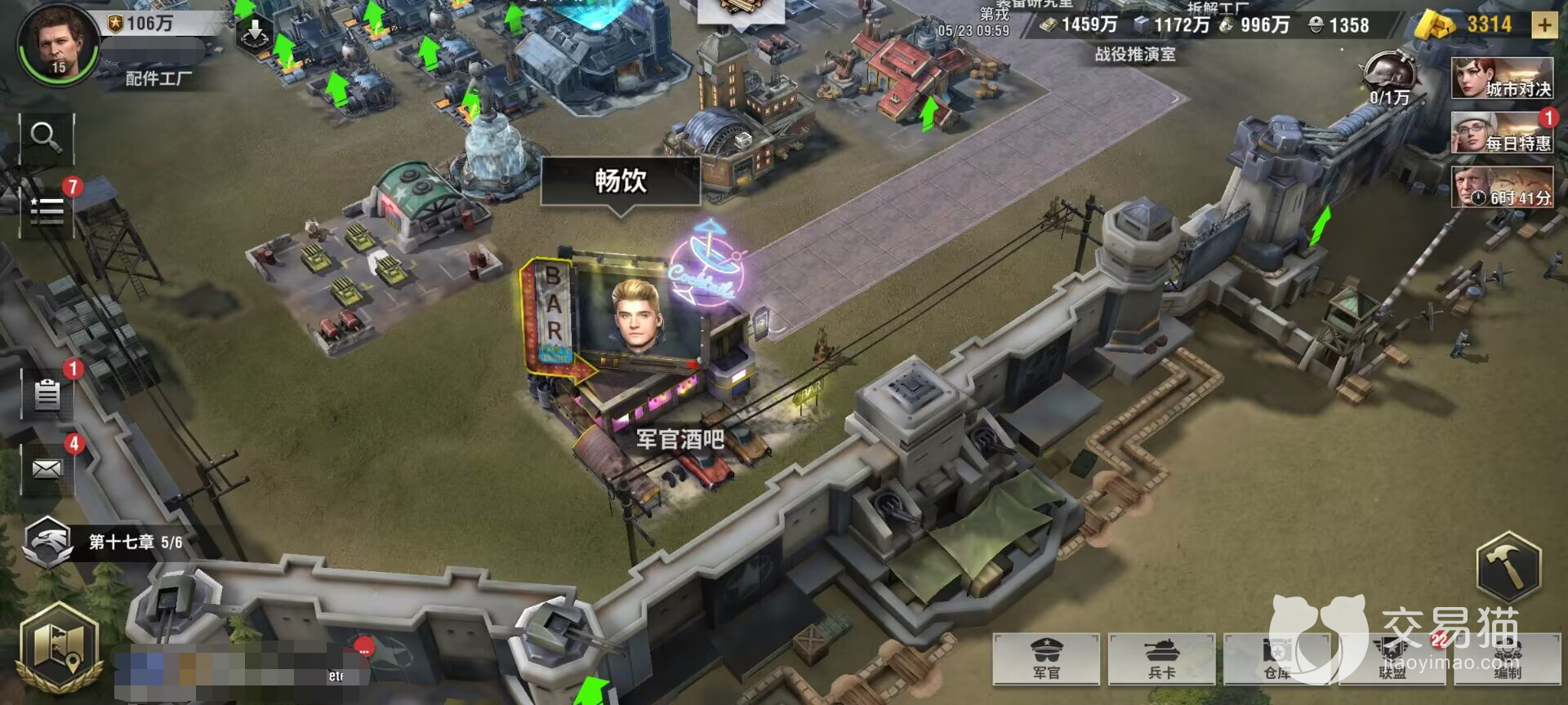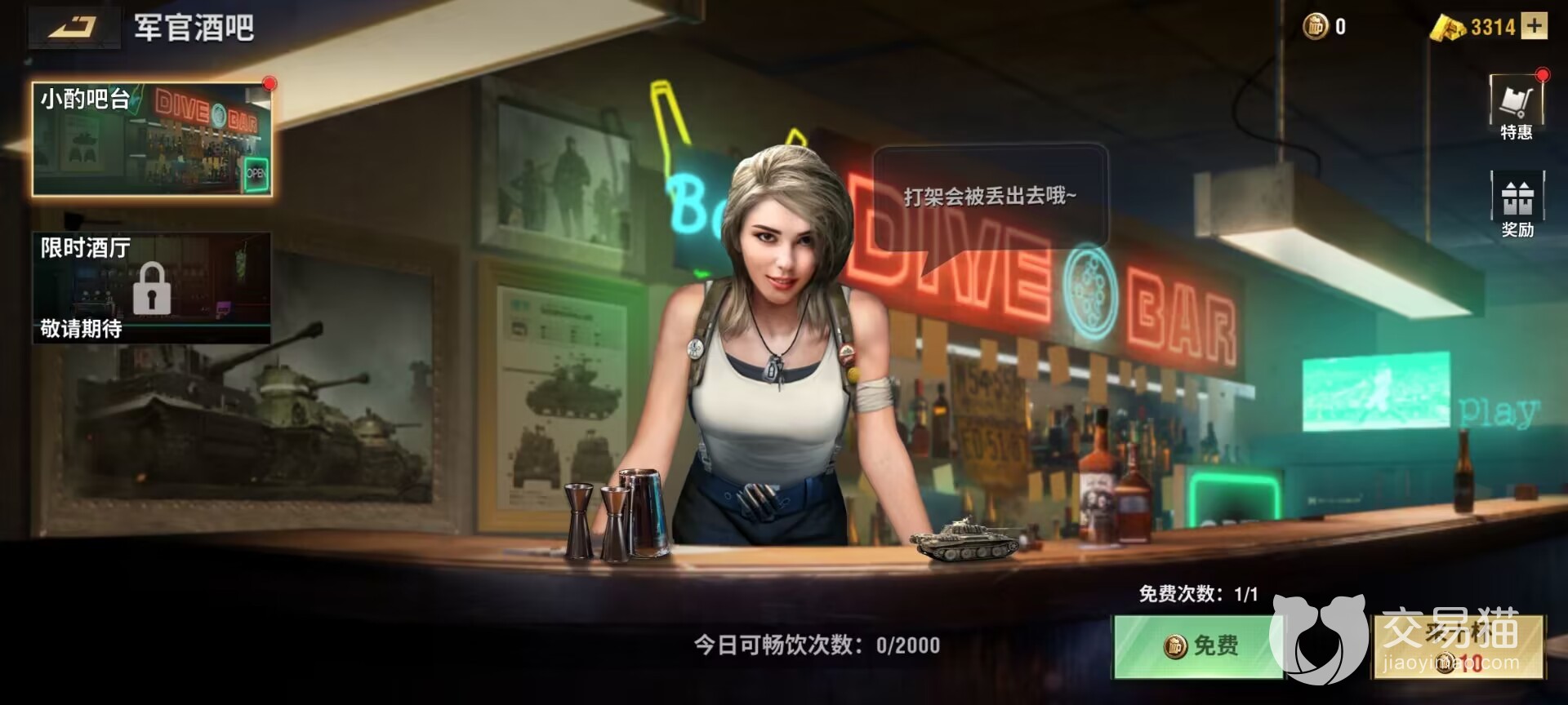 这个军官酒吧在建造完成之后,可以通过购买啤酒来抽取物资,进入酒吧之后,有非常有趣的吧台柜员提醒大家,在酒吧中不要闹事。相对于军需处来说,这个酒吧抽取的物资还是不错的,但是购买啤酒所要消耗的金币是较难获取的,可以完成每天的指定任务获得。