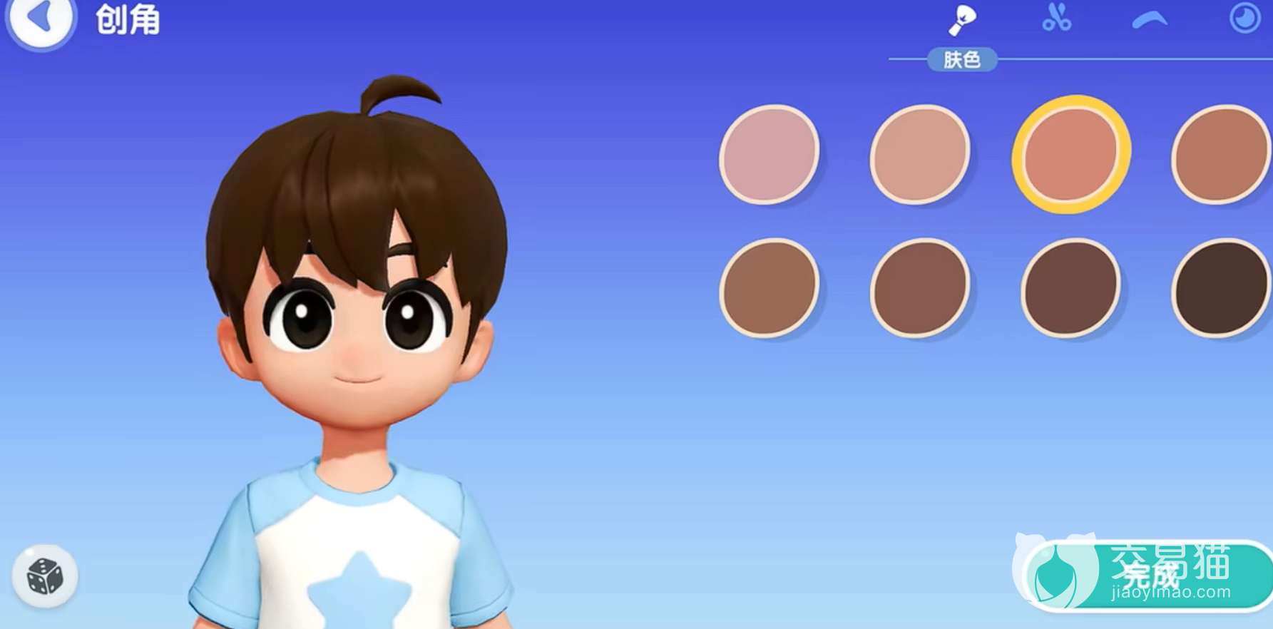 第一个环节便是肤色,本作在肤色方面分得非常细致,不仅有着我们常见的白皙面孔,也有着健康的小麦肤色,更甚至于还有黑皮可以选择哦。虽然模样都非常卡通,但仍能涵盖各位对于肤色方面的需求。