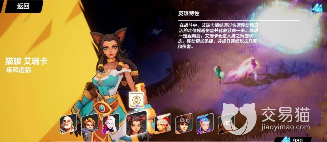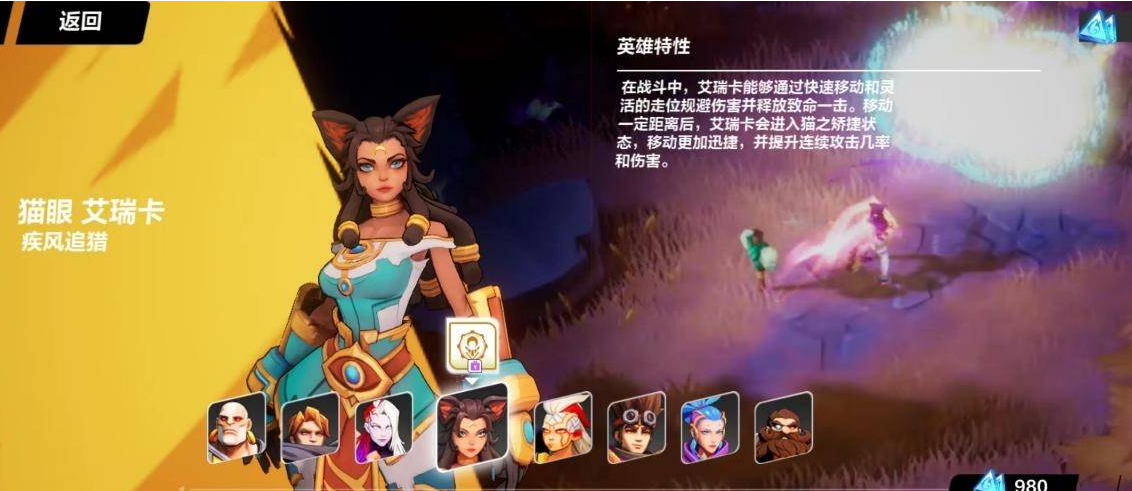 之后第三个职业是猫眼艾瑞卡,这个职业也被称为猫女,该职业需要花费980源晶来购买获取,适合有小氪念头的玩家,因为是氪金角色的原因,所以强度方面肯定是不差的。猫女在进入副本后会有一个移速buff,这也就让她拥有了远快于其他角色的跑图速度。