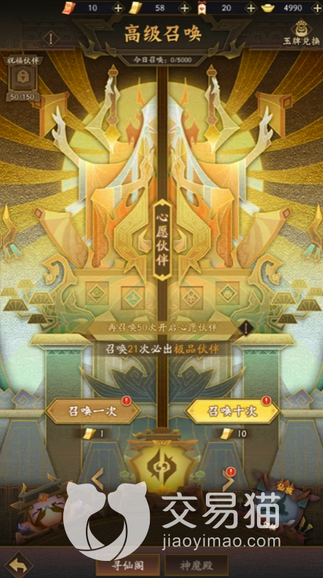 接下来,玩家又可以利用高级召唤来获取杨戬。不过此方式对于部分普通玩家不太友好,毕竟召唤道具在游戏当中并不是很好获取的,但各位可以凭借各种活动任务来累计,当可以进行十连抽的时候在进行使用。连抽也将帮助大家提升直接得到杨戬的概率。