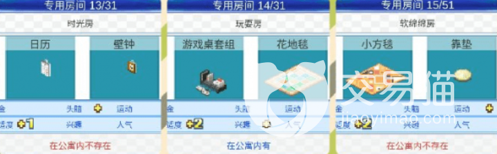 宠物房推荐玩家拥有宠物床和小方毯,同时一定要铺地毯,没有地毯的话是组合不了的。舒适度会增加9点,并且公寓的人气也会得到上升。