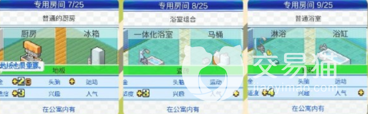 浴室组合需要玩家准备一体化浴室搭配马桶以及瓷砖,会增加3点舒适度。普通浴室需要玩家拥有淋浴和浴缸,会增加4点舒适度。