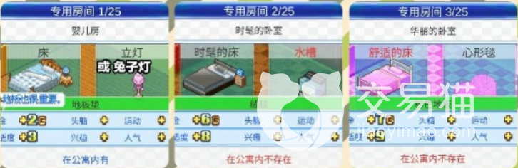 婴儿房间需要可爱的动物床,加上立灯或者兔子台灯搭配地板垫就能组合而成。租金会增加两个金币,舒适度也会增加3点。
