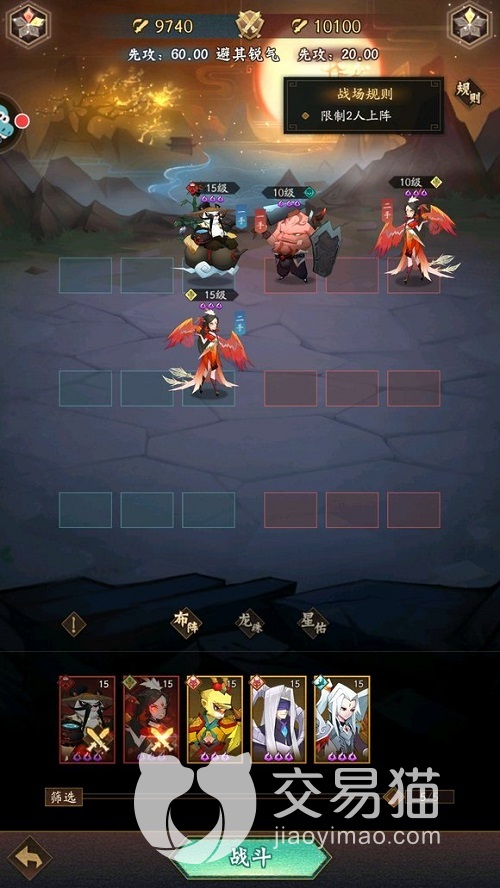 我们可以看到试炼之境——中避其锐气有限制角色上场数量,一个是增加游戏玩家的难度,另外一个就是防止玩家等级过高快速通关。这关卡也是给了五个人物,分别是:凤凰,熊猫烈风,飞卫,孙悟空,东皇太一。
