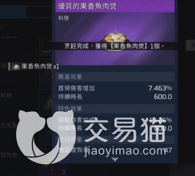 玩家可以用水果,水,鱼,肉来做水果鱼城堡。同样,这道菜也是以玩家放置于烹饪食材中的最高级食材为评价标准。正常来说,玩家只需要有一条紫鱼,一块紫肉,就能拿到一份高品质的紫罗兰果香鱼汤。增加弱点攻击加成后,也会提升统领攻击的百分率,效果都是600秒。