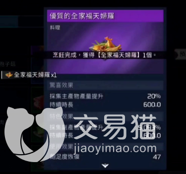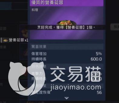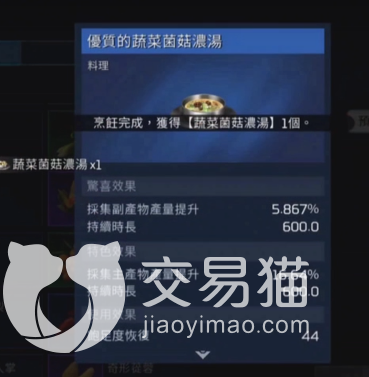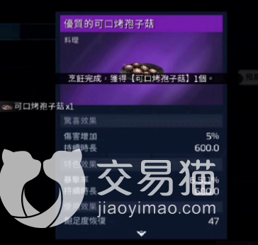 这道菜是用两块肉和香菇、蔬菜来制作和烹饪的,在食材的选择上相对简单,但是在效果上也非常好。可以有5%的意外伤害加成,还可以有5%的暴击加成。这是一个很好的恢复技能,可以维持600秒的时间。