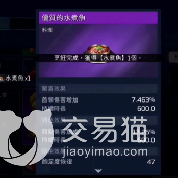这道菜是用纯净水、鱼、蘑菇和素菜烹饪而成。正常来说。蔬菜最好是选用胡椒,但是似乎其它的蔬菜也可以用来做这道菜。高品质的“水煮鱼”,除了能让人有饱腹感等基本回复能力之外,还能在“虚弱”和“统领”两个属性上有很大的提升,可以推荐给任何一个玩家使用。