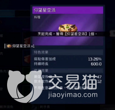 这道菜的名气很大,就算没有打过游戏的人,也应该知道这道馅饼菜的名字。在游戏里,它的原料是水、小麦、鱼类和肉。玩家可以使用上述4种食材来制作出“仰望星空”。材料的话,相对来说要简单一些,但利润还是很高的。这玩意儿除了能让人吃饱喝足之外,还能让人受到大约10%的致命伤,效果维持600秒,算是最基础也是最实用的增益食物了。
