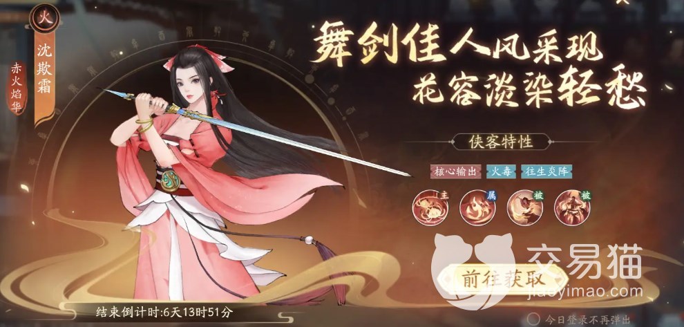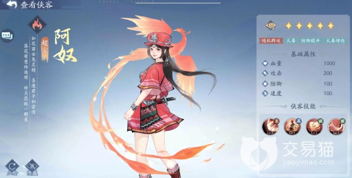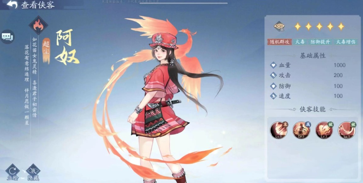 这一位比较特殊,是目前新推出的角色,是火系稀有级别的侠客,所以获取上有一点小难度,不过强度肯定也是有保障的。怒气技“云霞漫天”,全屏伤害加概率附加火毒,火毒的效果是在回合结束施加无视防御的伤害。升级能提升概率,如果目标身上有3层debuff那么概率提升至100%,这个技能是沈欺霜的核心输出技能,值得优先升级。属性技“赤火炎华”则是提高自己的最多20%的基础属性、30%暴击和命中。普攻“点绛流丹”,普通的单体伤害,升级后概率附加1回合火毒并且变为群头伤害,这个效果就非常给力了!