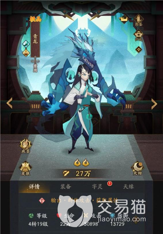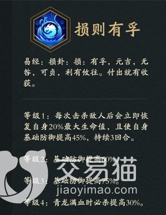 它主要技能为飞龙在天,当对手血量低于30%,将打出额外30%攻击,这一效果每个行动回合激活一次。
