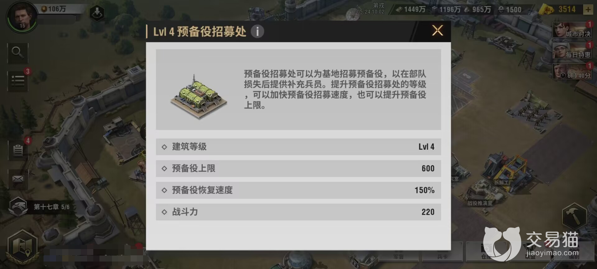 预备役部队与编制部队不同,编制不对,可以随时出击去攻打敌方阵营,也可以参加各种剧情任务,然而,预备役部队就显得作用比较小了。对于等级低的小伙伴来说,可能还没有接触到,这应该是需要将等级升级到15级左右才会开放建造,建造的建筑物叫做预备役招募处,这个建筑物可以招募预备役。