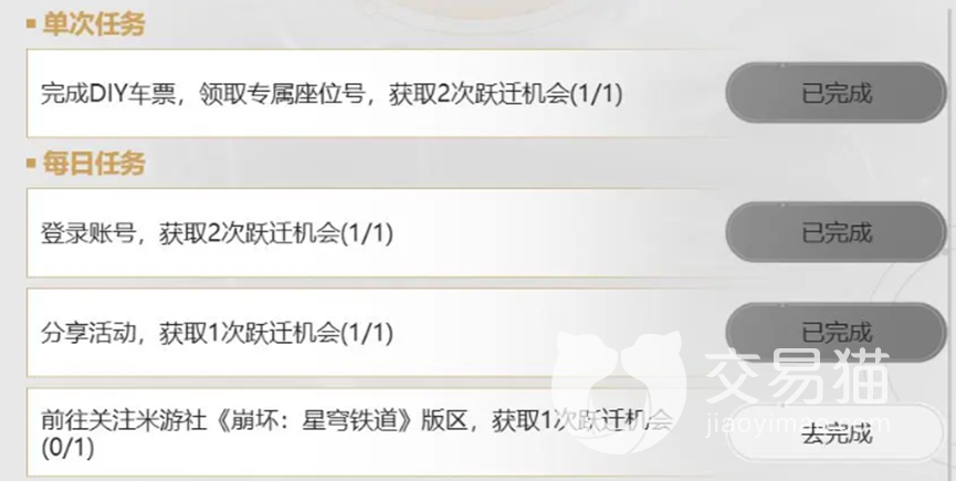 网页的第一个活动就是【跃迁】,在活动生效期间,每一位符合要求的开拓者都可以在每日登录的界面通过完成任务来获得【跃迁次数】,【跃迁】的开启时间到5月24日为止,兑换时间到6月6日为止,且每个账号只能获取一次奖励哦。