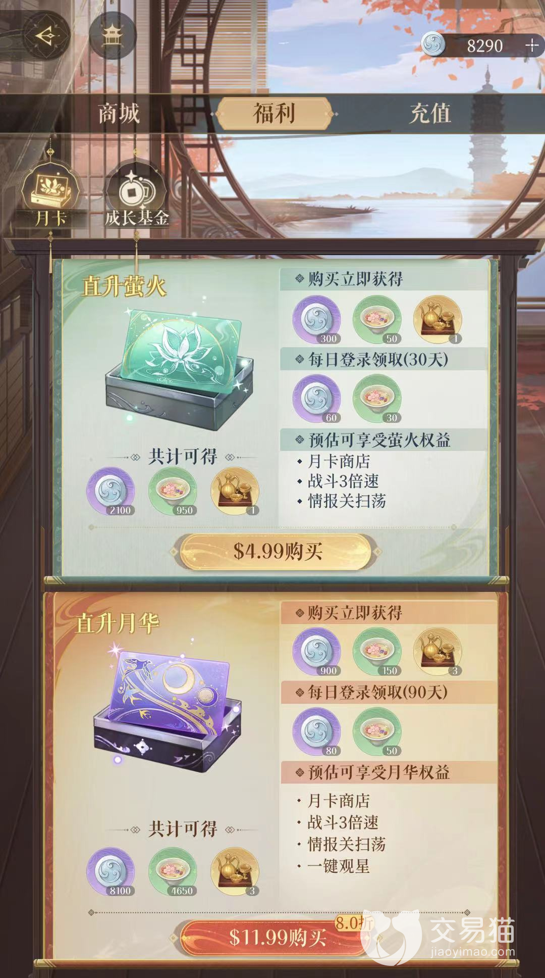 游戏里面月卡分为萤火和月华,后者每天可领取的白金币与体力值多二十点。首次开通月卡的玩家可以选择花费白金币直升昭阳,可以开启的权益更多,昭阳还能去换男主角们通用的互动花环道具。在抽卡方面,活动限定卡池一般持续时间两周到一个月,抽到限定角色的概率提升,方便玩家进行突破。而活动卡池结束后,活动角色会进入普通卡池,玩家同样有几率抽到,所以并不要求强氪。