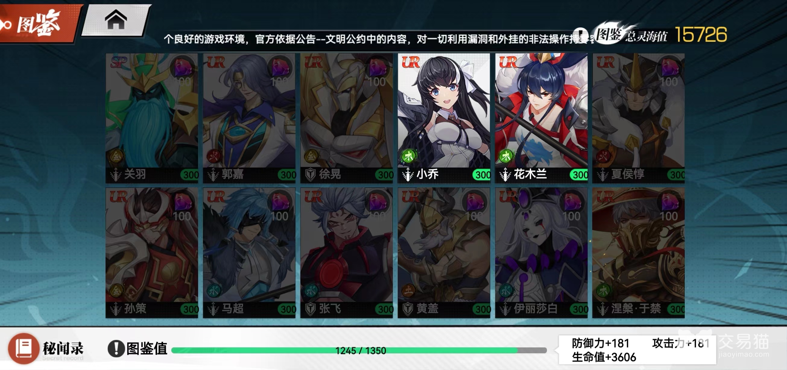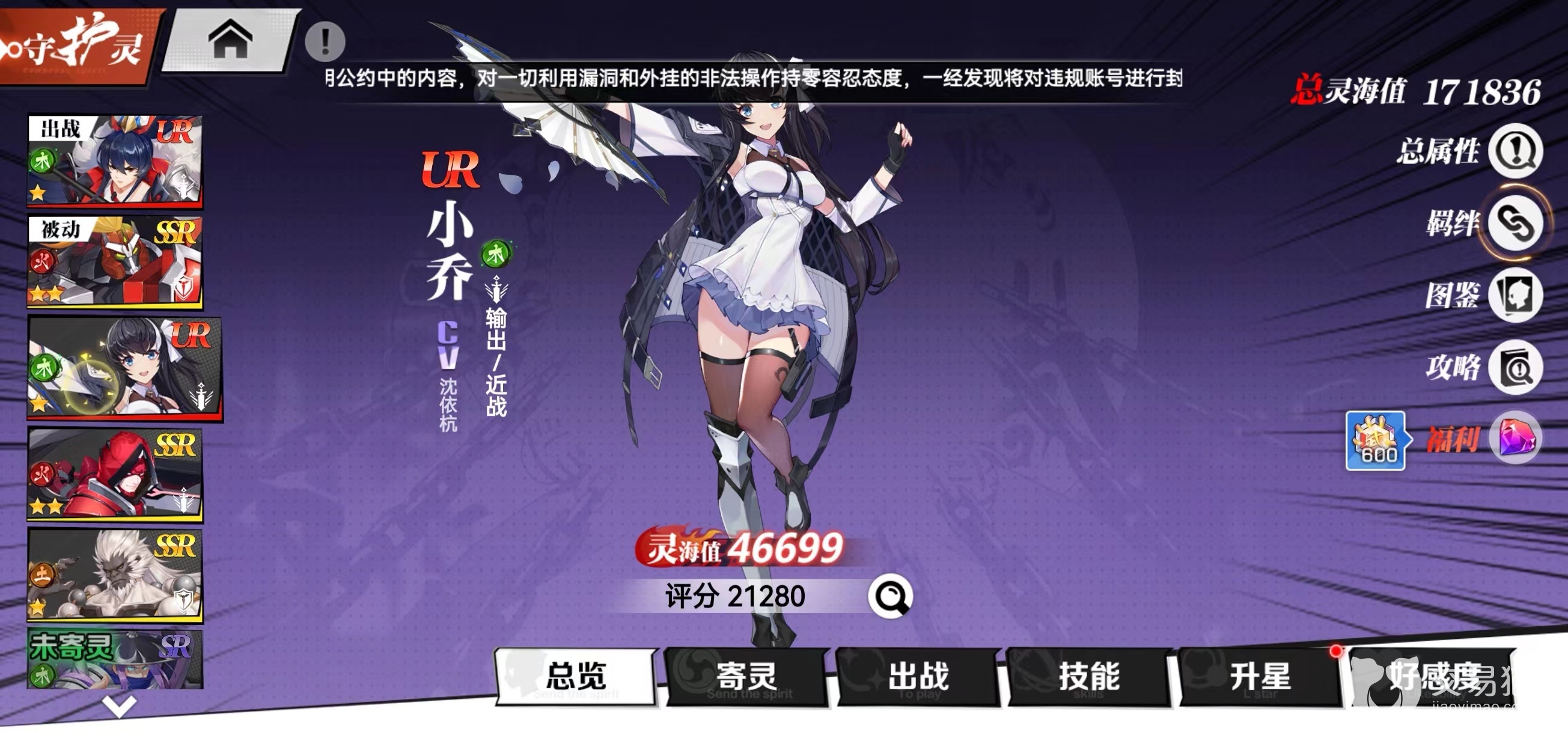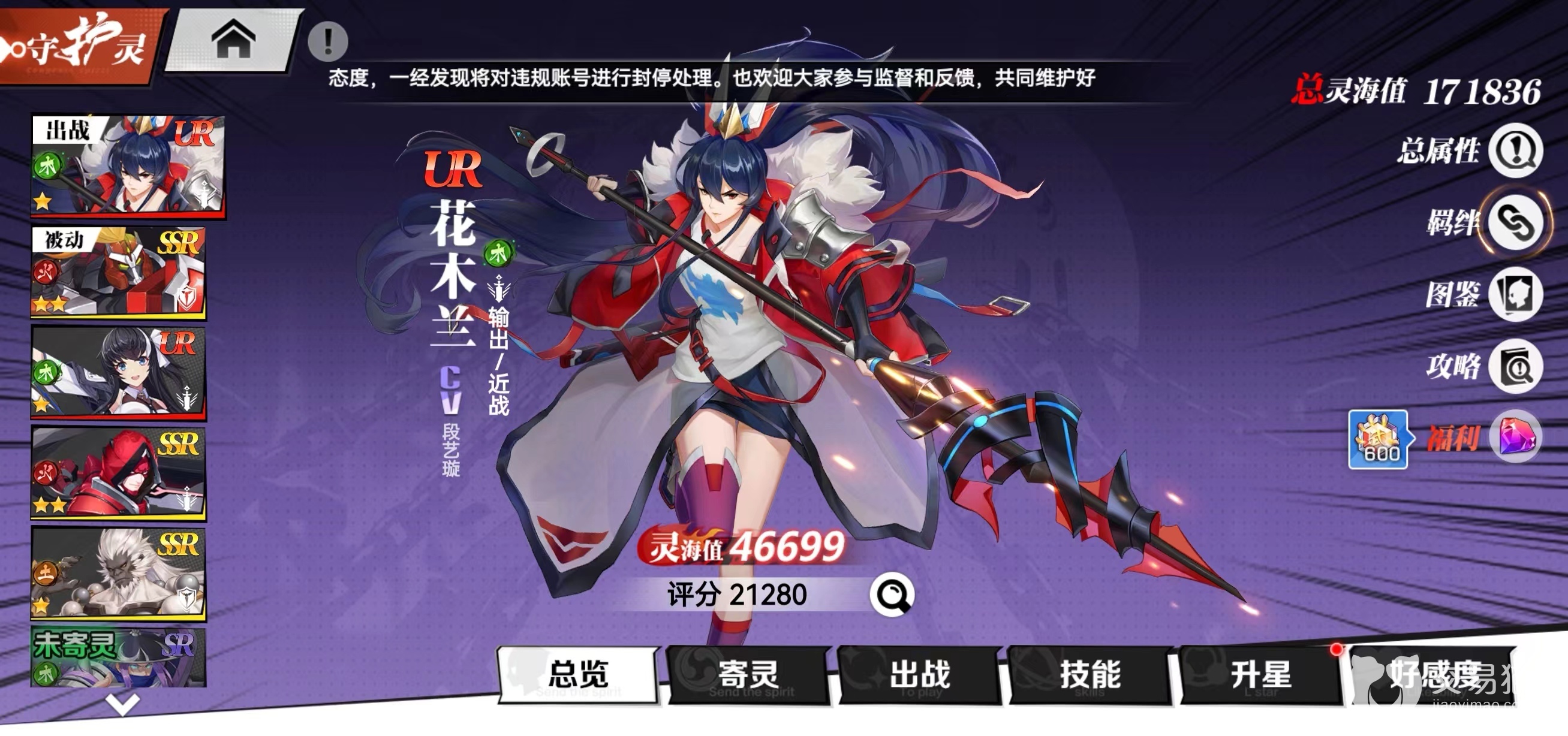 1.首先是新人必练的SSR守护灵许褚,新手阶段就可以送一个,之后抽卡的出货率也是比较高的,虽然级别低于UR但是前期过度非常不错,而且可以和其他多位守护灵触发羁绊。