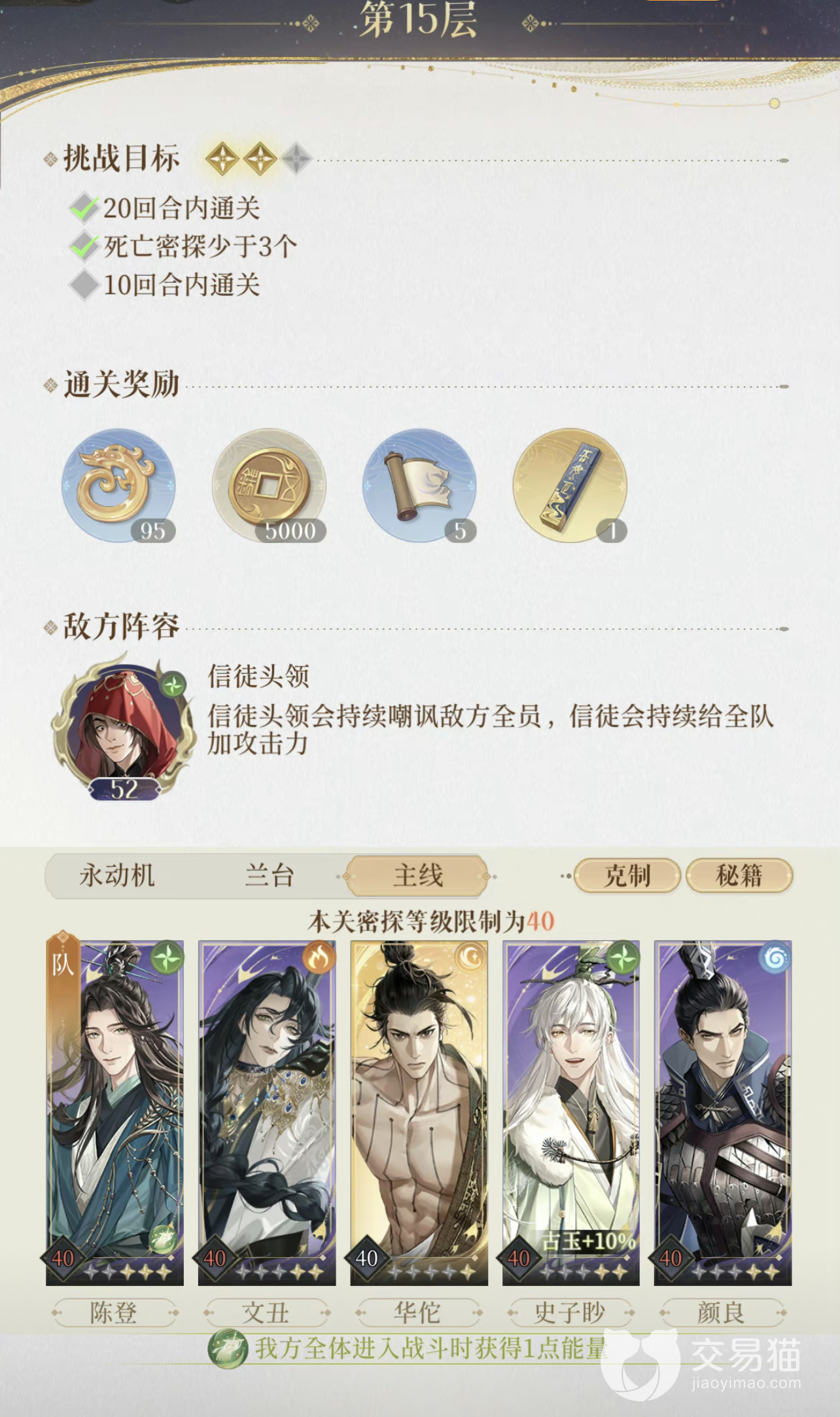 这个一星阵容的组成密探为陈登、文丑、华佗、颜良和史子眇,如果玩家们并未拥有华佗这名金色密探,也可以使用其他群攻密探进行替换。在队伍进行实战时,需要使用陈登作为队长,这名密探的队长技能将会在战斗开始时为队伍中的所有密探提供一点能量,帮助队伍内的密探更快的释放出技能,加快战斗进程。