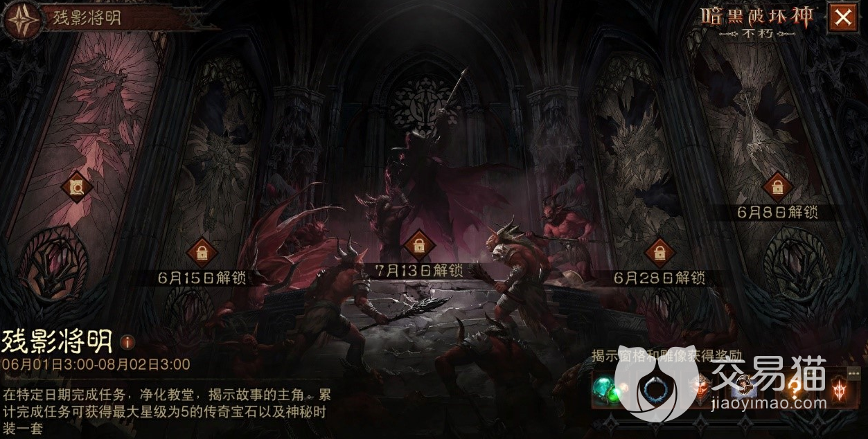 紧接着教堂活动到来的是一个叫做黑暗盛典的活动,在这个活动中大家只要完成一些任务就能获得宝箱和宝箱钥匙,开启宝箱后就能拿到多枚强化不朽钥石,这个石头的重要性大家应该都知道吧。