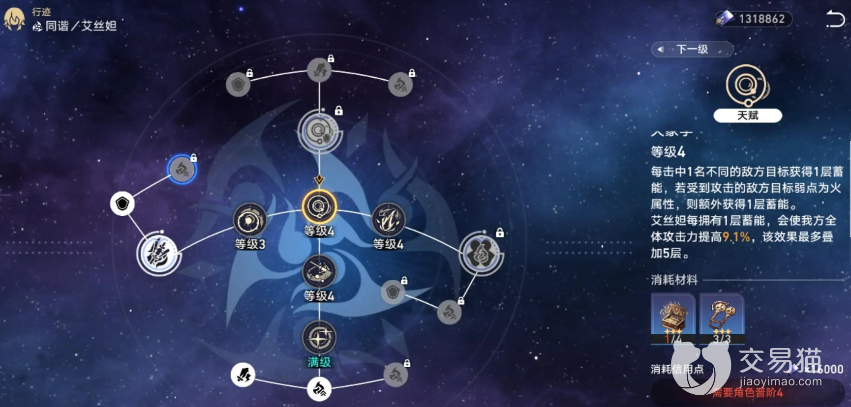 这里先来说说艾丝妲,她的加点方面有限选择天赋和终结技,这种主要是为了给她提供一些增伤和加速效果。如果与其搭配的队伍是火系的,那么就可以将与火伤相关的能力都给点上。