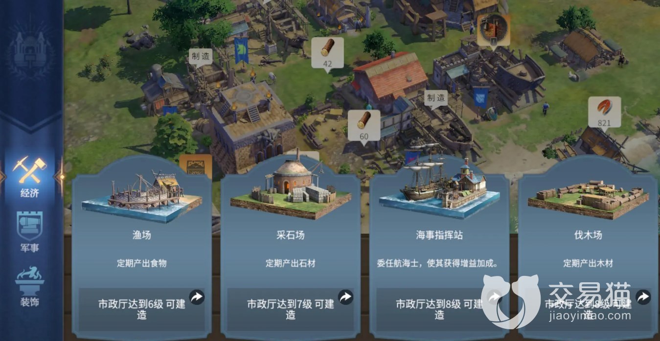 资源类建筑主包含伐木场、采石场、渔场,能够产出木材、石料、食物。这种资源建筑在游戏初期是很重要的,可一定要重视起来哦!