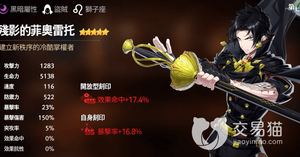 菲奥雷托是一名五星角色,属性为暗,其定位属于刺客,攻击力高达1,183点,血量值为5,138点,速度值为116点,防御力为523点。