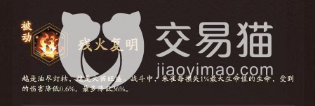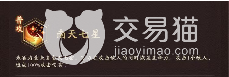 再就是它的一个普通技能了,名叫南天七星,如果在游戏中使用这个技能的话,可以在我们战斗的过程中对对方进行攻击,并且还能将自身的生命值给持续恢复,只要我们去攻击敌人,那么敌敌人必定会受到一定的伤害。还有一个技能叫做残火复明,这个技能是在我们战斗的过程中,如果说朱雀被对方的敌人攻击到的话,就会损失了一定的生命值,那么它就可以在游戏中使用残火复明这个技能了,这样不管对方敌人怎么对它进行攻击。所受到的伤害都会降低很多。这个技能是在朱雀血量低的时候,拥有这个技能之后,游戏中朱雀的力量才能真正的展现出来,别看游戏中它只剩一丝丝血量,但是血线会在被动的加成下成为对方敌人难以攻破的一个点。