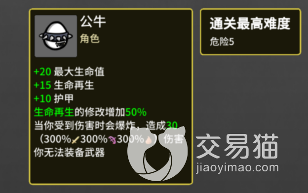 在公牛这一角色介绍界面中,我们可以发现公牛的属性是+20最大生命值,+15生命再生,+10护甲,而且公牛是一位回血型的游戏角色,在该角色受到攻击时,公牛会出现爆炸效果对敌人进行攻击。每个角色都不是十全十美的,同样公牛同样也有缺点,公牛在远程攻击时不能使用武器,但是可以在近战中稍稍的装备一些武器,这时候武器会帮公牛增加一些基础属性。