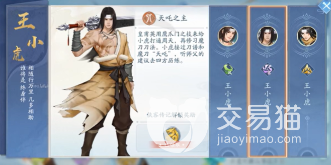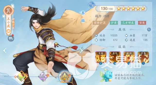 那么王小虎这位角色呢在游戏中是拥有两个不同的形态的,一个是儿童时期属于是水属性,一个是成年人状态下的是属于土属性,并且初始都是五星哦,在极大部分角色中是非常稀有的类型呢,我们可以看到儿童时期的水属性技能是【滴水成渊】,可以对前排的玩家造成高额伤害,并且之后角色会获得一层护盾效果,该护盾可以提供百分之十的减伤。