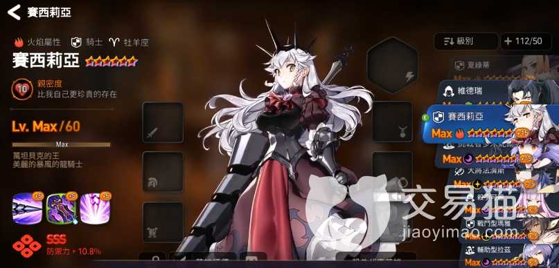 满技能的情况下一技能可以实现50%的回合,还可以破甲,二技能有50%的几率可以实现两回合的群减攻,在半血的状况下可以实现100%全力发动进攻,三技能是群嘲讽,血量高的情况下,伤害值也是非常高的,这也是一种全能的表现,在骑士角色当中属于比较强的攻防表现了,血量和防守以及速度都比较强悍,在竞技场上使用二三技能,会对敌人造成较高的干扰度,只是纯肉类型的骑士角色,在现在的版本不是太吃香,因此还是属于t1级别。