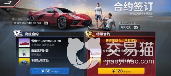 第三档是特级合约,这个不太建议小氪玩家去购买,它的售价是128元,它里面的东西基本上在高级合约中都已经有了,不过它能让大家立刻获取到前面介绍的雪佛兰corvet te C8'20,要是等不及想要立马获取到这个车的玩家可以选择购买一下。
