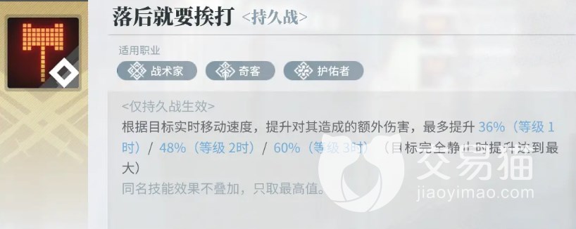 目前烙痕技能最高能升到3级,烙痕技能并不是全职业通用的,有的烙痕技能只对特定的职业生效,例如“落后就要挨打”这个技能只适用于战术家、奇客以及护佑者,能根据目标的移速提升对其造成的额外伤害,目标精致伤害加成最大。