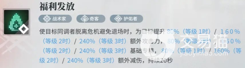 例如“福利发放”这个技能,在角色规避了退场的时候提升高额的攻击、专精、减伤。不过一般这种准线技能的获取难度有点高。首先“潜航”这个准线碰到的概率就不高,其次即便碰到了还需要完成前置的准线才能得到技能,这个难度也是很高的,当然准线技能的强度的确很高。