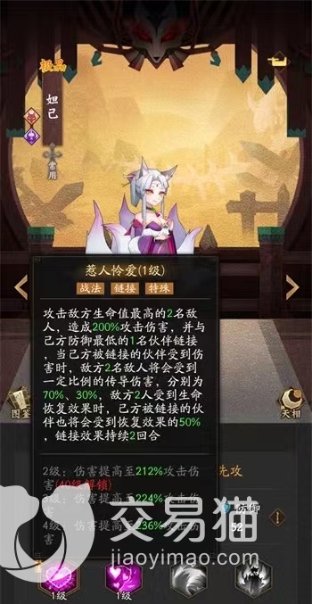 玩家朋友们在了解了妲己这个游戏小伙伴的获取方式以后,还要去了解一下妲己的技能属性。想必玩过神仙道3这个游戏的玩家们都晓得,妲己的技能是“惹人怜爱”,这个技能可以去攻击敌人中生命值最高的两名敌人并且可以给对方造成巨大的攻击伤害,还可以与敌方防御值最低的伙伴进行链接,让其受到一定的传导伤害。妲己的这个技能战法在坦克阵容里面是十分吃香的。