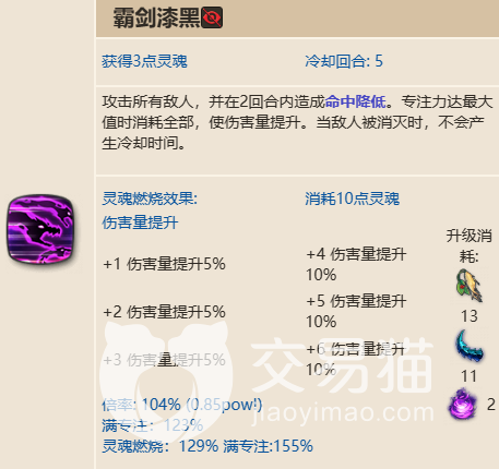 霸剑漆黑是他的大招,可以攻击所有敌人,并降低他们的命中率。如果专注力达到最大值,可以消耗全部专注力提升伤害。如果敌人被消灭,可以不产生冷却时间。