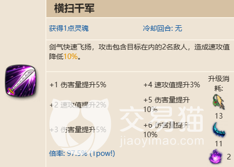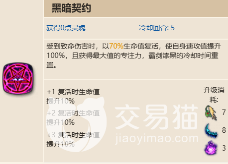 横扫千军是他的普通攻击,可以攻击两名敌人,并降低他们的速度。黑暗契约是他的被动技能,可以在受到致命伤害时以一定比例的生命值复活,并提升自身速度和专注力,同时重置霸剑漆黑的冷却时间。