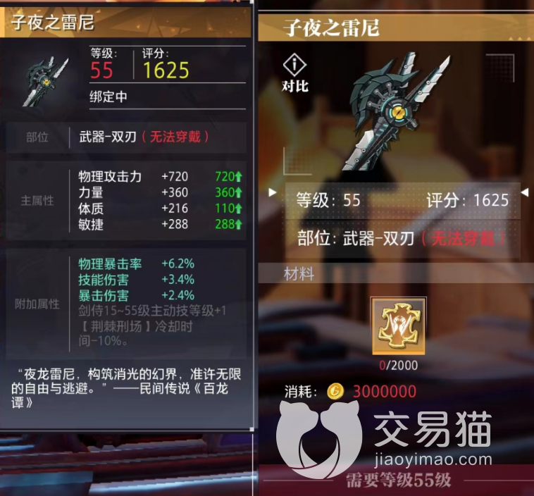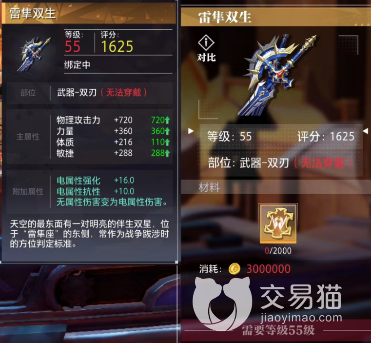 雷隼双生:具有附加属性,与剑侍的属性相契合,可强化剑侍的电属性,电属性抗性增加10点,无属性的伤害将转换为电属性伤害。目前最高等级到55级,55级时装备的评分1625,主属性中的物理攻击720,体质216,敏捷288,力量360。