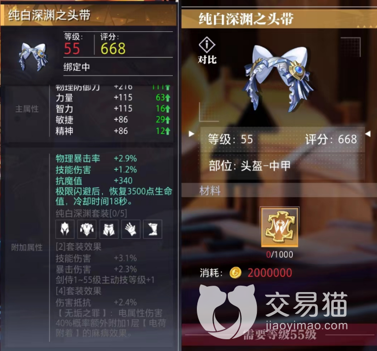 纯白深渊之头带:角色头部装备,55级的时候评分为668。主属性增加物理防御216,力量+115,智力+115,敏捷+86,精神+86,附加属性有提高角色物理暴击2.9%,技能伤害增加1.2%,抗魔性增加340,当角色闪避成功后,恢复3500生命值。