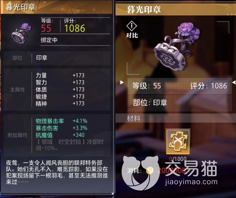 腕带“暮光腕套”,主属性提升魔法防御力、力量、体质、敏捷,鹰返的暴击率+40%。戒指“暮光戒指”,主属增加魔法防御力、体质、敏捷、精神,将暮色追击转为暗属性并获得55点暗属性强化。印章“暮光印章”,主属提升力量、智力、体质、敏捷、精神,附加属性:领域•时空封锁冷却时间-10%。