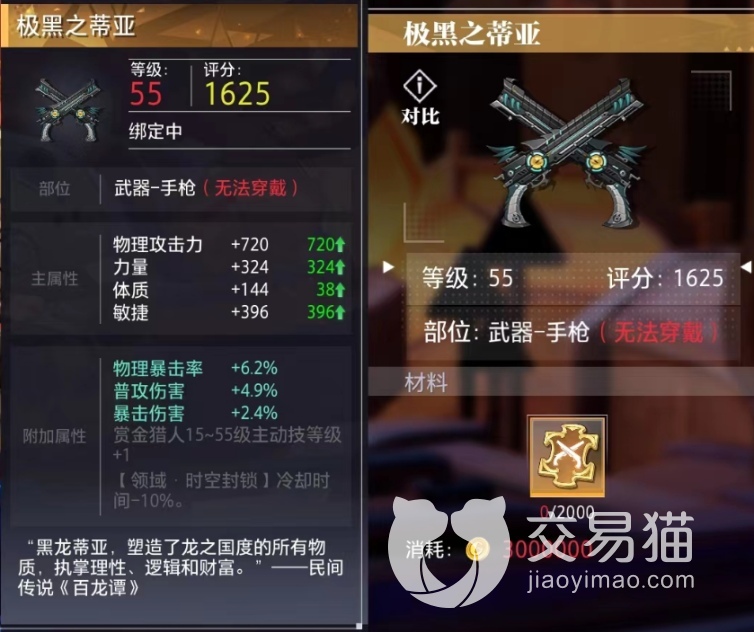 武器位“月蚀之寂灭”,主属性依次是物理攻击力、力量、体质、敏捷。附加属性可让无属性伤害变为暗属性伤害。武器位“极黑之蒂亚”,主属性依旧为物理攻击力、力量、体质、敏捷,副属性增加伤害和暴击率,并使赏金猎人15~55级主动技等级+1,“领域•时空封锁”冷却时间-10%。