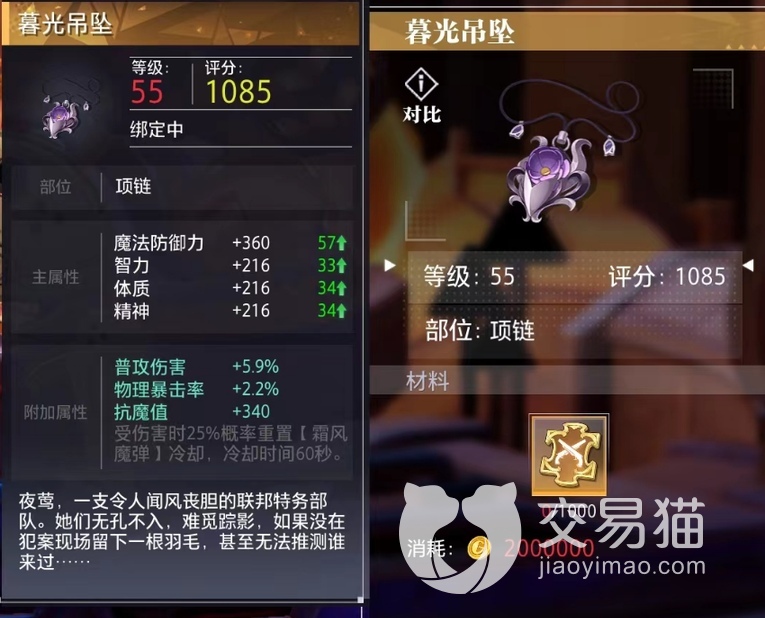 头盔“幽羽夜莺之帽”,主属性增加屋里防御力、力量、智力、敏捷、精神,副属性在极限闪避后,恢复3500点生命值,冷却时间18秒。项链“暮光吊坠”,主属:魔法防御力、智力、体质、精神;副属性在受到伤害时有25%概率重置霜枫魔弹冷却,冷却时间60秒。