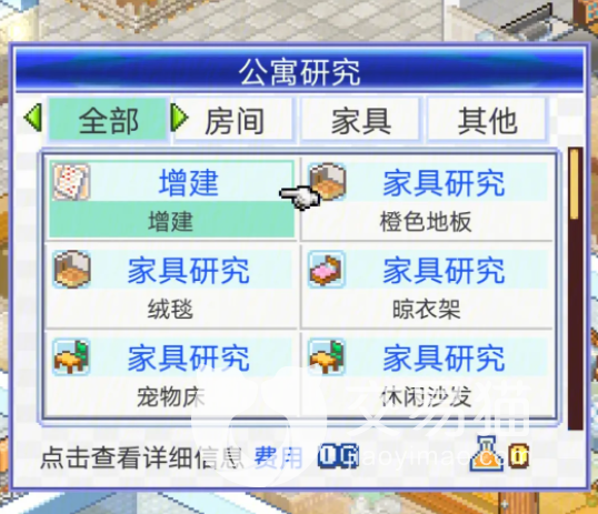 文化家具包括大书架,化妆台,电子琴等一系列家具,这类家具能够给居民提升的舒适度都非常高,但是租金很低。设备家具包括窗户,花坛,树等等,其花费费用非常高,但是提升的舒适度不高,玩家们想要美观的话,这一类家具也是少不了的。