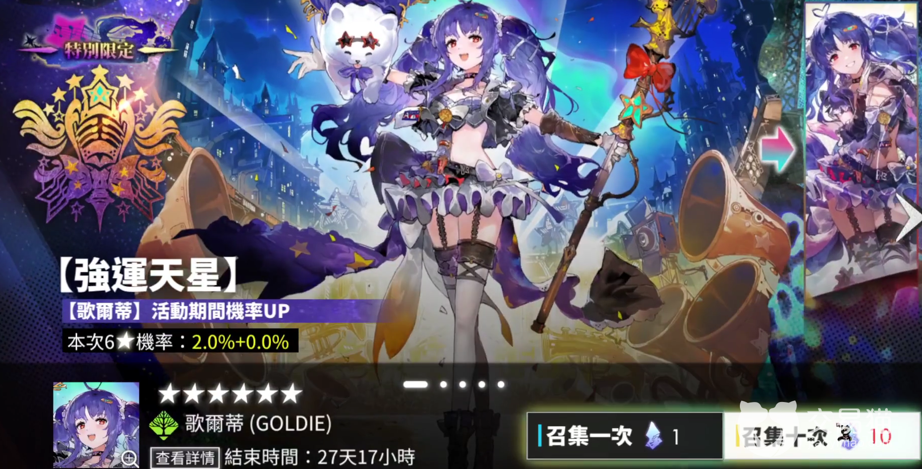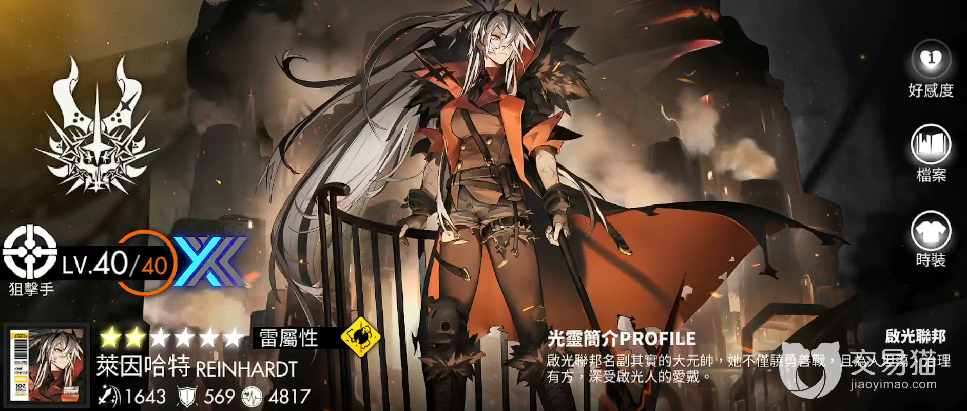 高贵的限定角色,作为周年限定池子限时up的她角色单卡强度方面很高,拥有目前最顶尖的爆发和输出能力。其效果可以额外增加技能的覆盖率,在雷系队伍当中,如果有缺少核心输出位的话,非常推荐抽取。基本上作为玩雷队的玩家,莱茵哈特如果出现up,那么是必定会抽的角色。