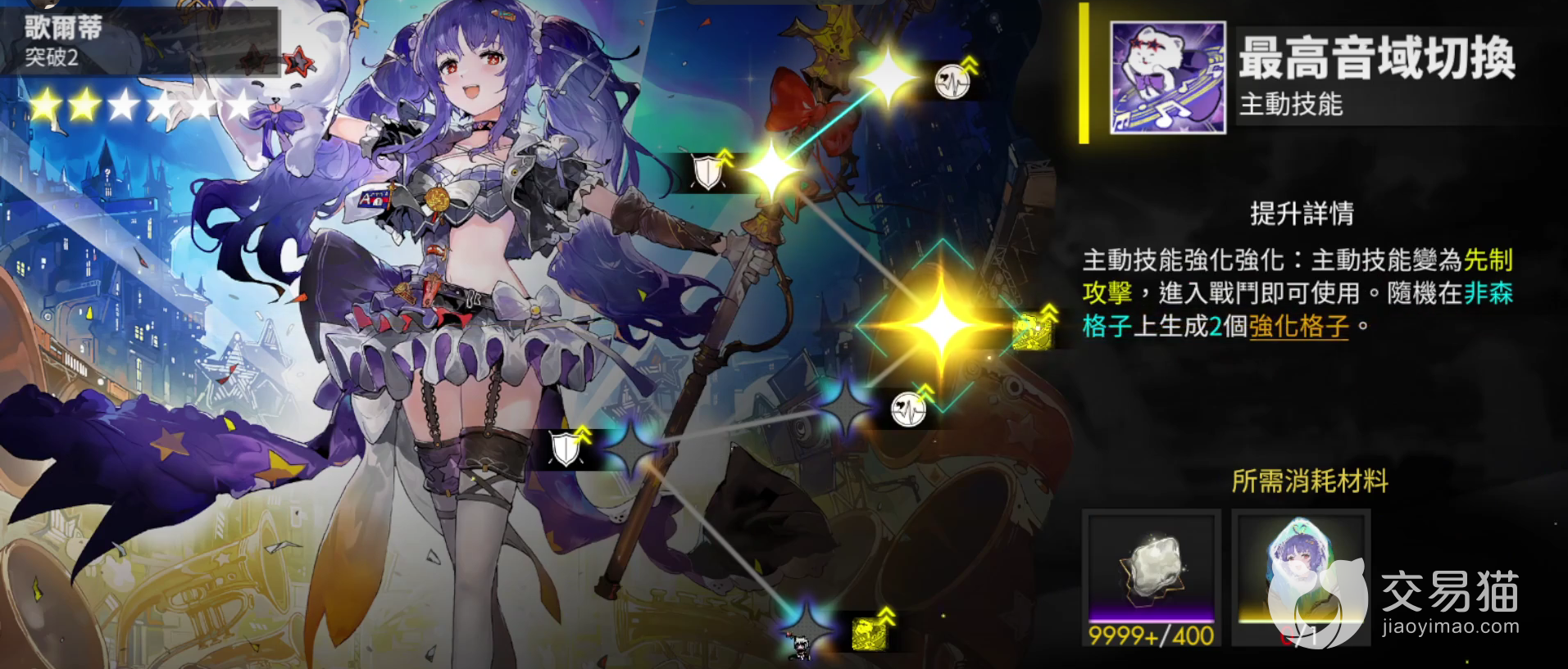 其主动技能使用后,本回合可以从偶像状态转换为战歌状态,并且可以穿过敌人的格子,强化格子可以作为彩色通用格子使用。连锁技能方面,偶像状态下,连锁可以给队友带来治疗效果,战歌状态下,可以给对敌方造成大量伤害。装备技能部分,每当队伍获得八个强化格子,可以在距离最近的一个非森林属性的格子上生成一个强化格子。