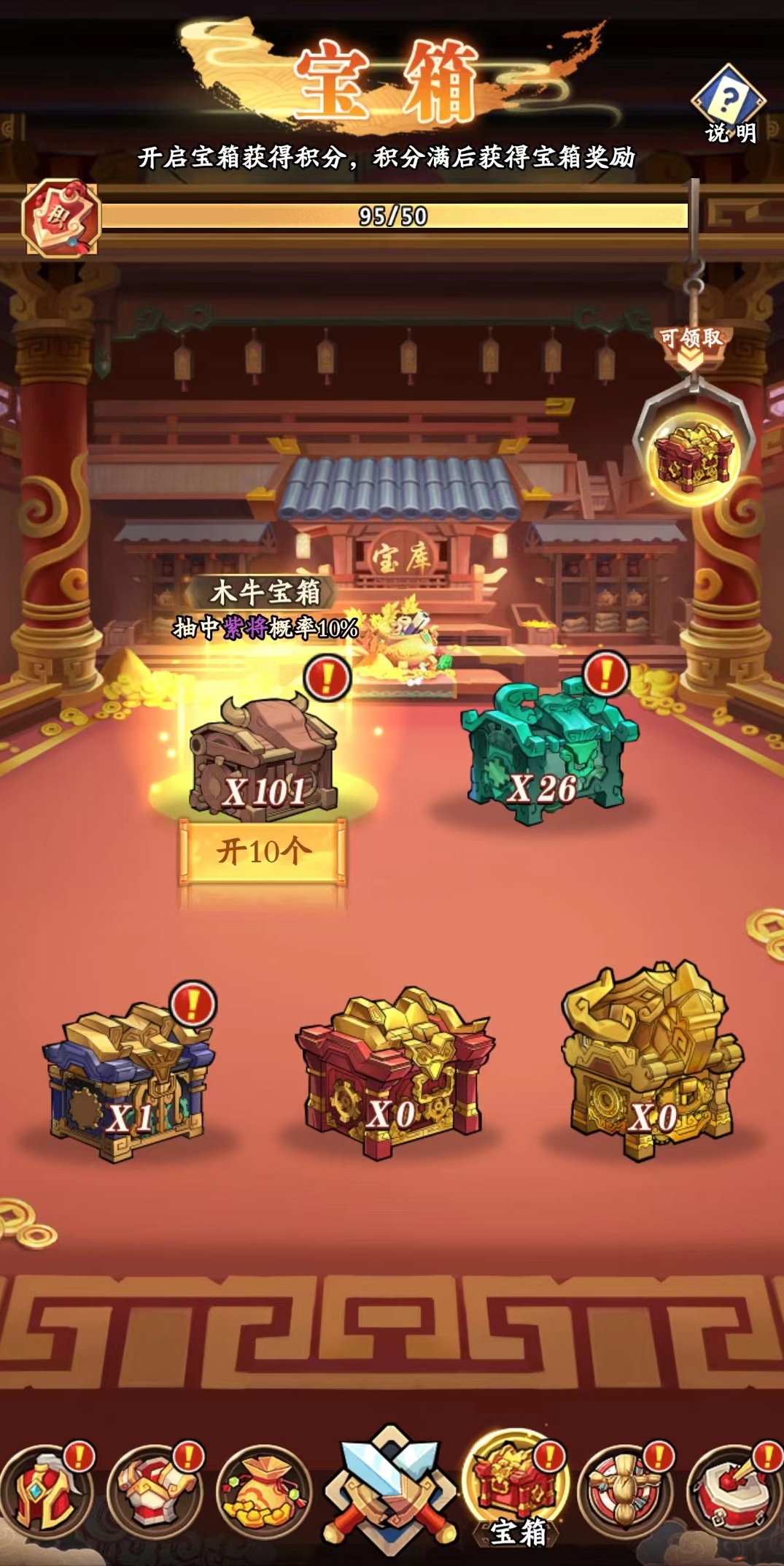 所以玩家在游戏中要做的事情其实并不多,提前搭配好阵容,等到收集够资源之后就拿出来提升一下。包括升级、进阶以及升星等,升星需要的武将碎片除了不断抽取获得,还可以通过开宝箱方式。宝箱是非常重要的一项内容,通过各种活动获取积分都能得到箱子,开启箱子后有大量强化道具以及武将整卡赠送,一定要及时开启。