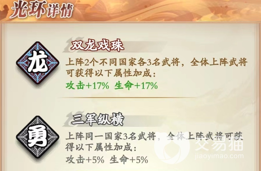 在布阵的时候一定要考虑到光环效果,目前最为出色的就是双龙戏珠,五虎争霸三足鼎立和六合天下。其中六合天下最为强势,但是需要上阵同一国家6名武将,这样不利于后期培养,也会造成浪费。所以小编最推荐的就是双龙戏珠,两个不同国家各自出战三名武将,属性加成不低,培养起来更简单。