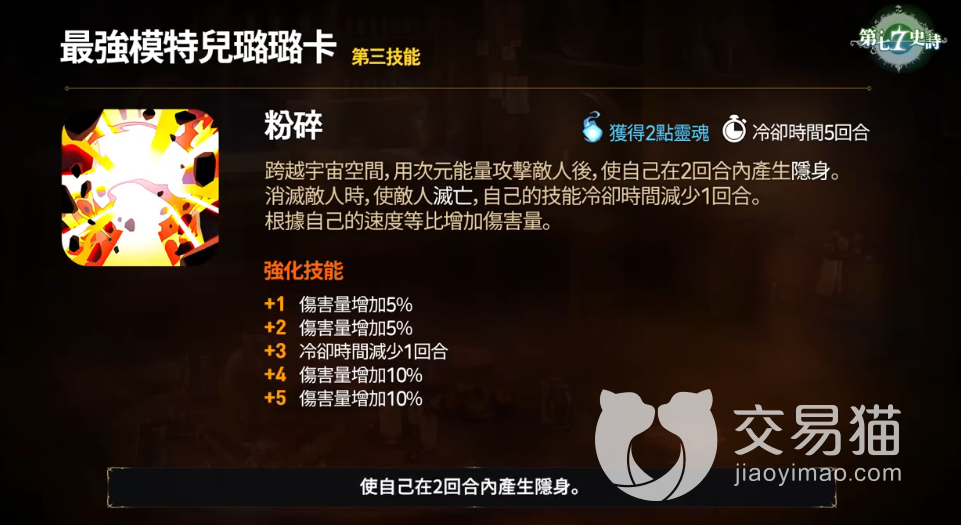 最后一个就是粉碎:在使用次元的能量打击敌人后,让自己能够在两回合内隐身,使除自身外的全体我军人员在两回合内攻击力提升。消灭敌人时造成灭亡效果,并使自身技能冷却时间减少一回合。根据自身速度等比提升伤害量。