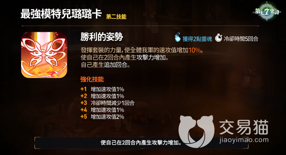 第二个技能胜利姿态:这能使全体我方的所有人物的速攻增加15%,而且还会使她自己的攻击力增高两个回合,甚至还能再来一个回合。该技能堪称璐璐卡的辅助神技了,能够直接增加本身和己方的速度和攻击力,并且可以获得一个额外的行动机会,可以用来释放其他技能或者和队友搭配形成新的套路。
