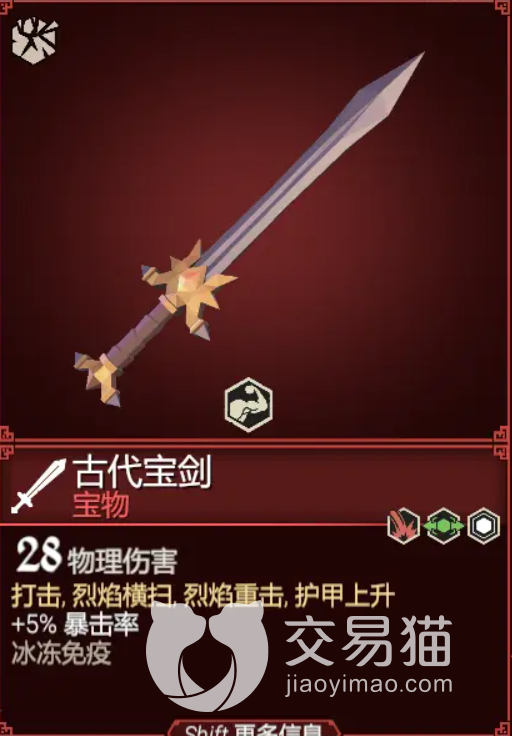 古代宝剑,游戏中最好用的宝剑武器之一,28点的基础物理伤害,并附带有打击,烈焰横扫,烈焰重击,护甲上升等一系列效果,并且作为火焰武器的它还额外增加了5%的暴击率以及非常重要的冰冻免疫效果,在对付冰属性敌人时非常有用,简直就是神器。